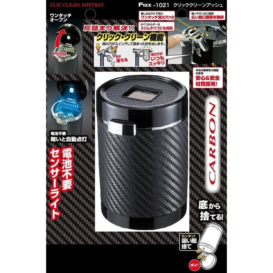 車用 灰皿 Fizz-1021クリッククリーンアッシュドリンクホルダー型 カーボン調ブラックLED付 汎用 ナポレックス 携帯農業 畑 トラクター キャンプ アウトドア